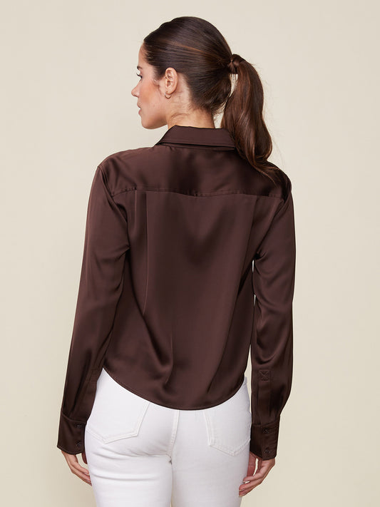 Crinkle Faux Leather Long Sleeve V-Neck Blouse