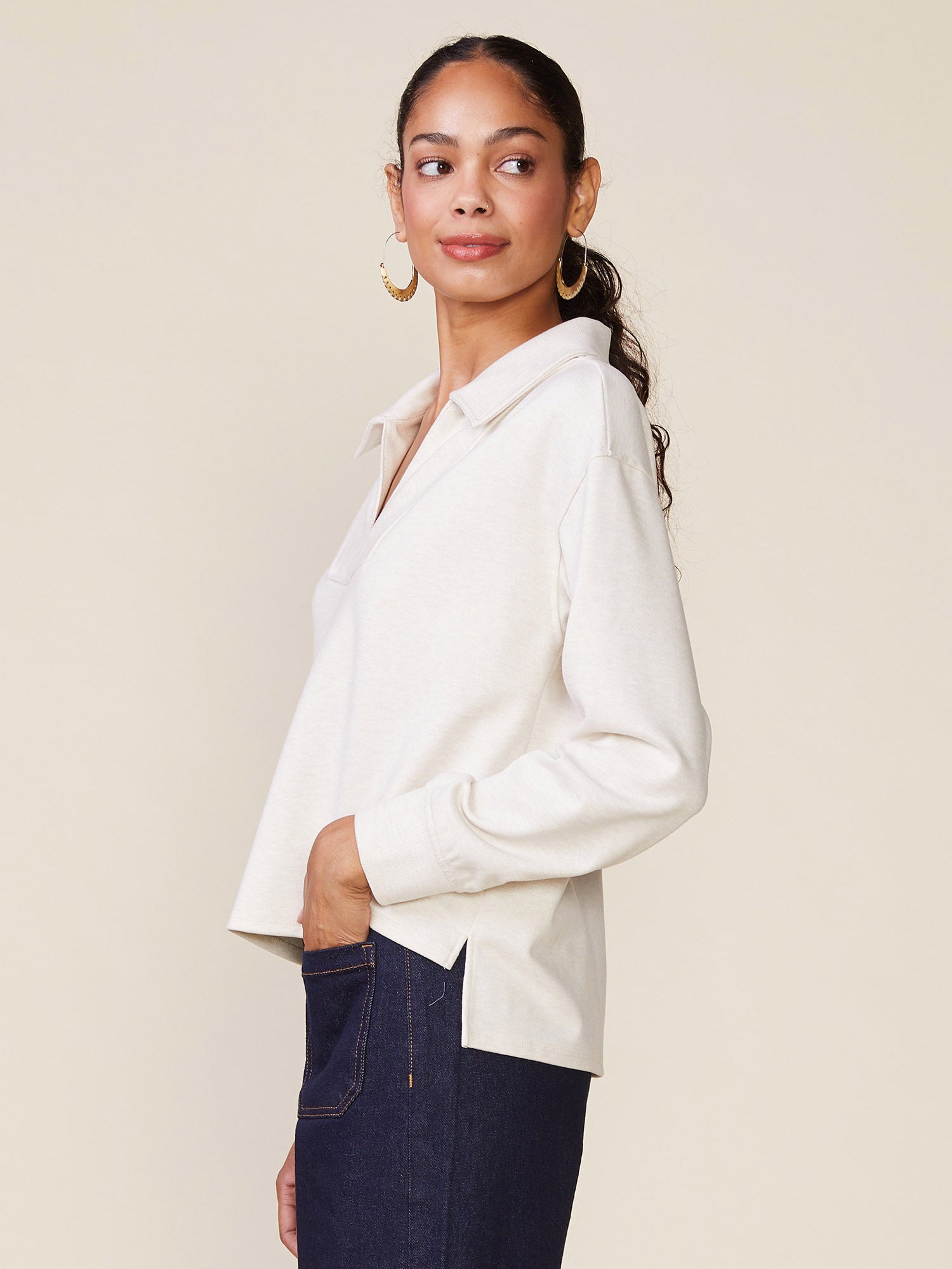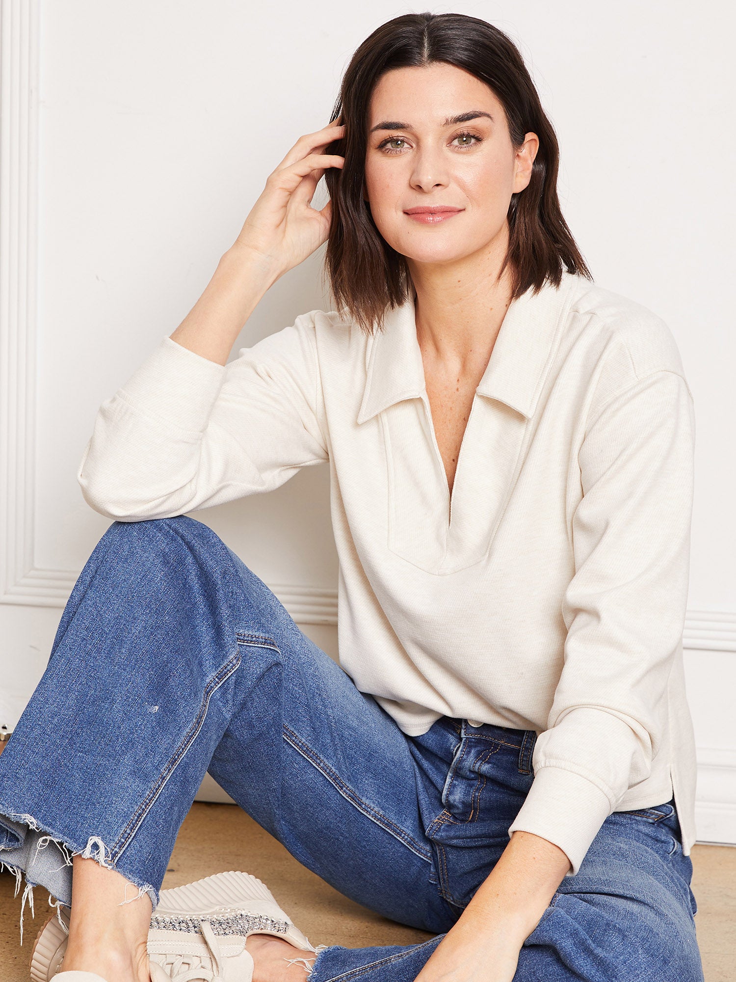 This polished pullover is made in a brushed knit twill featuring a flattering v-neckline and collar with an uneven hem and subtle side slit. Soft, modern, and easy to style, this pullover is the perfect blend of comfort and elevated everyday style.
