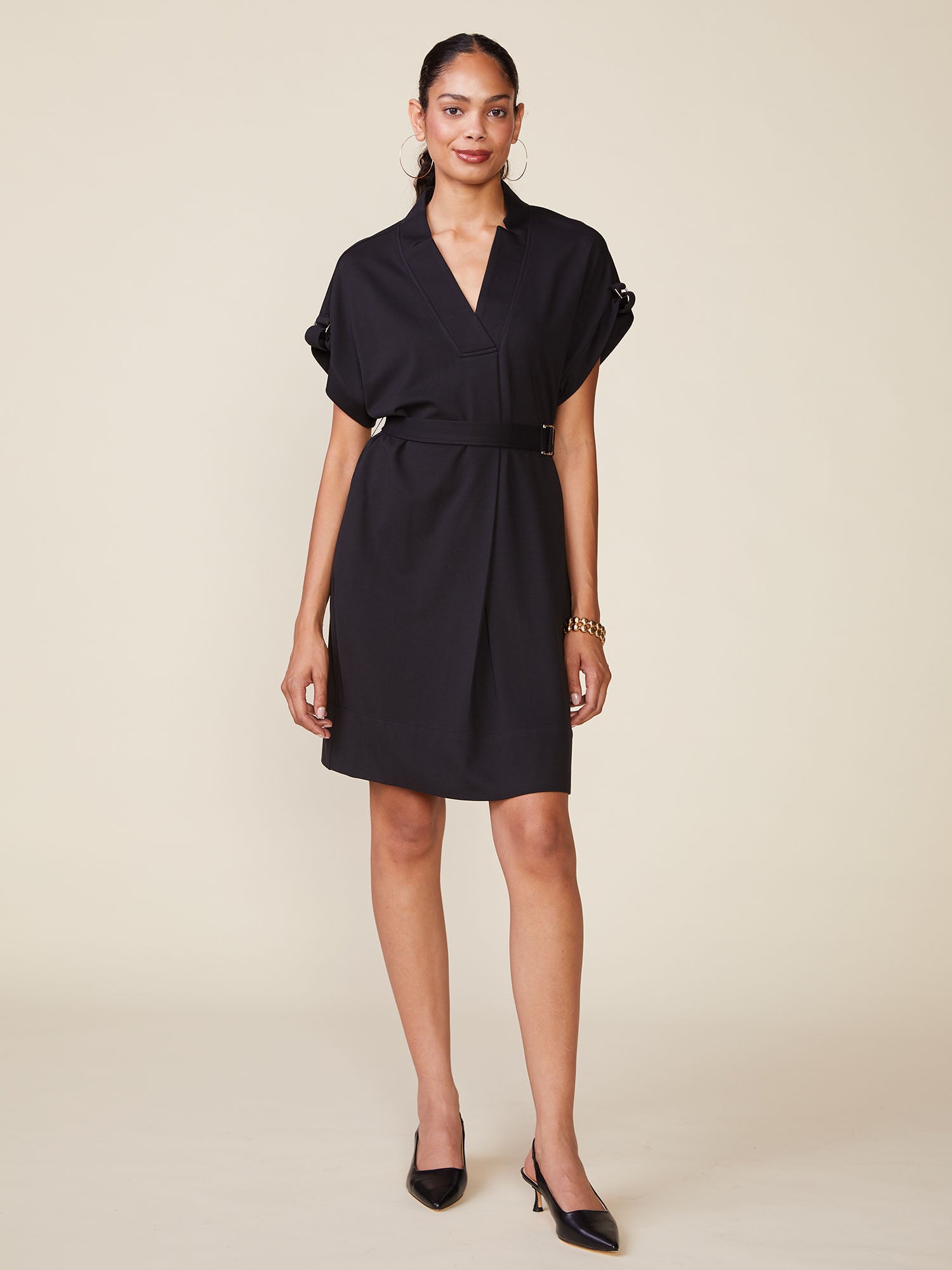 The Cuffed Belted Ponte Dress is an easy wear dress from day to night. Wear it belted to accentuate your waist, unbelted for a free-flowing silhouette or change it up with a leather belt from your own collection for more variety. The Ponte fabric is lush and flowy. The notch detail along the neckline and touches of hardware at the sleeve keep it interesting. And yes, she's got pockets!