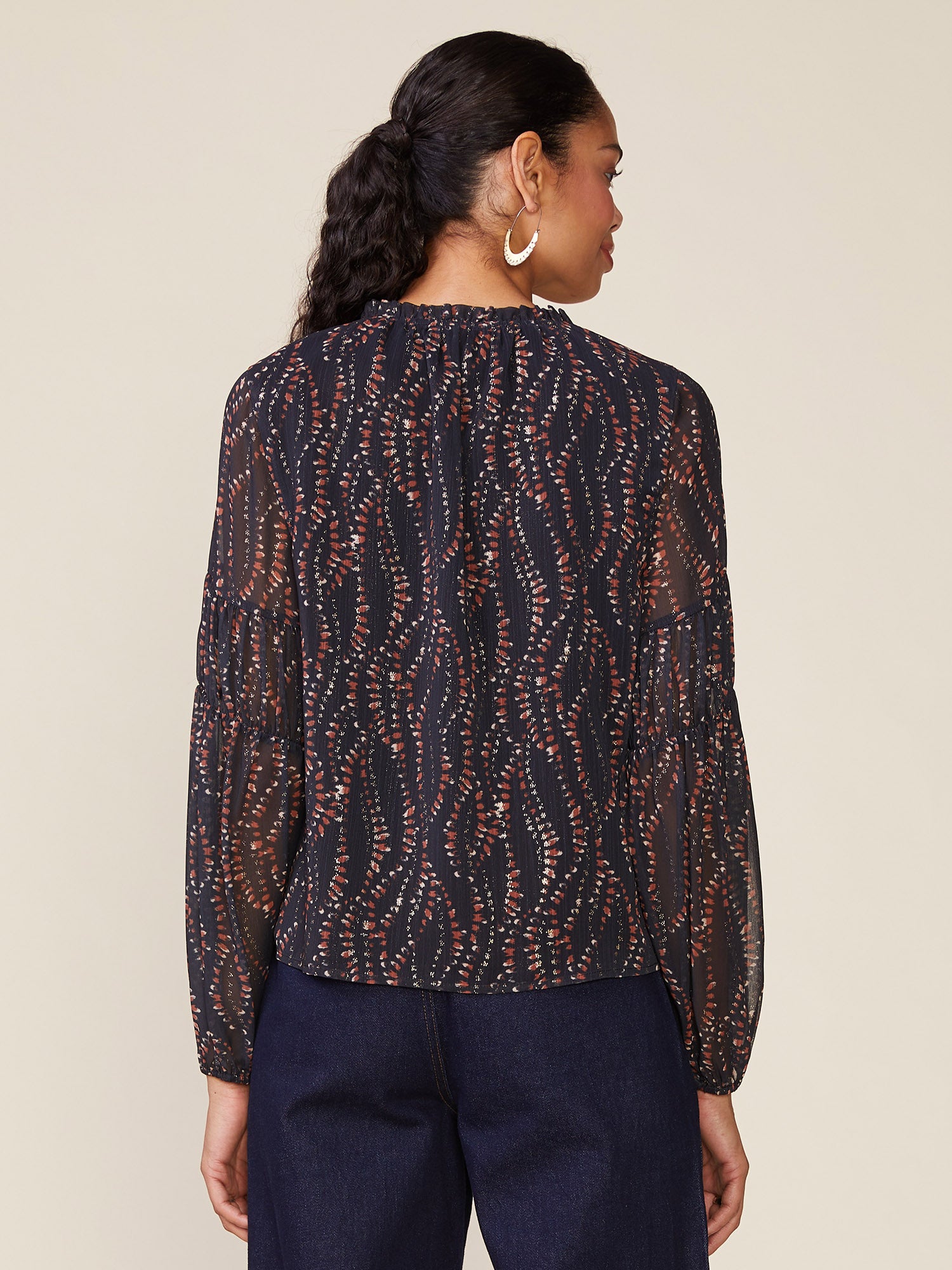This long sleeve, airy statement blouse is made of an intricate foil print for just the right amount of shimmer. Easily worn from day to night, this blouse features an open neckline, ruffle accents and sheer sleeves.