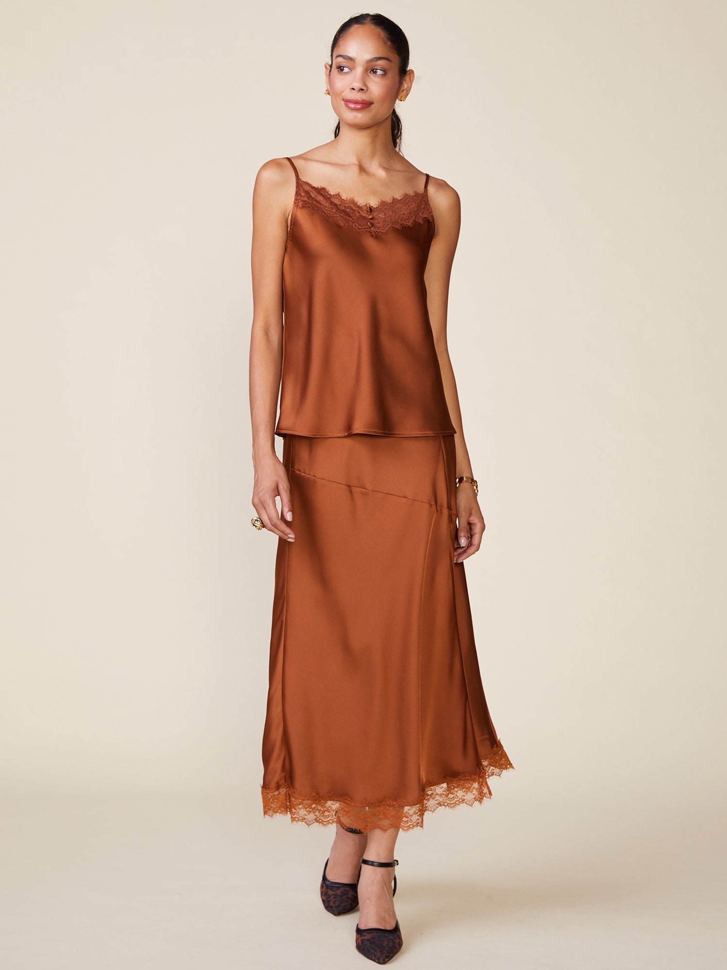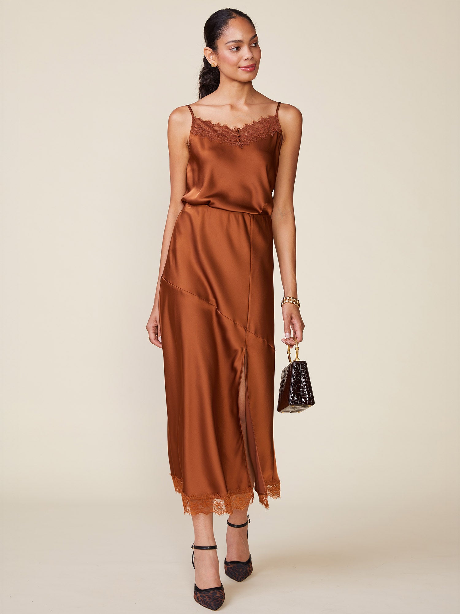 Our satin midi skirt drapes effortlessly on the body offering a flattering fit. A mid-thigh slit, and delicate lace trim give this satin skirt a feminine, romantic feel perfect for elevated looks and special occasions.