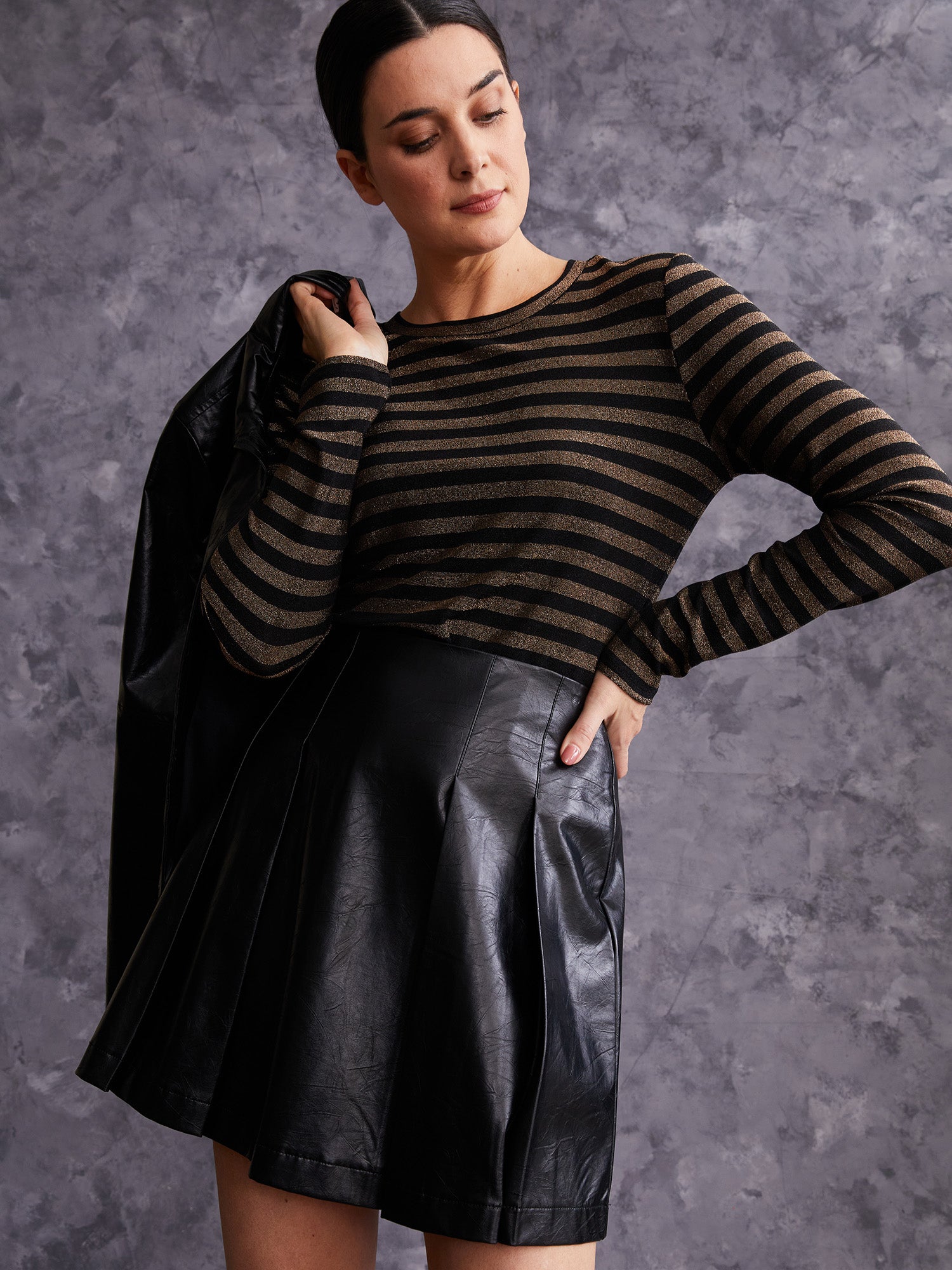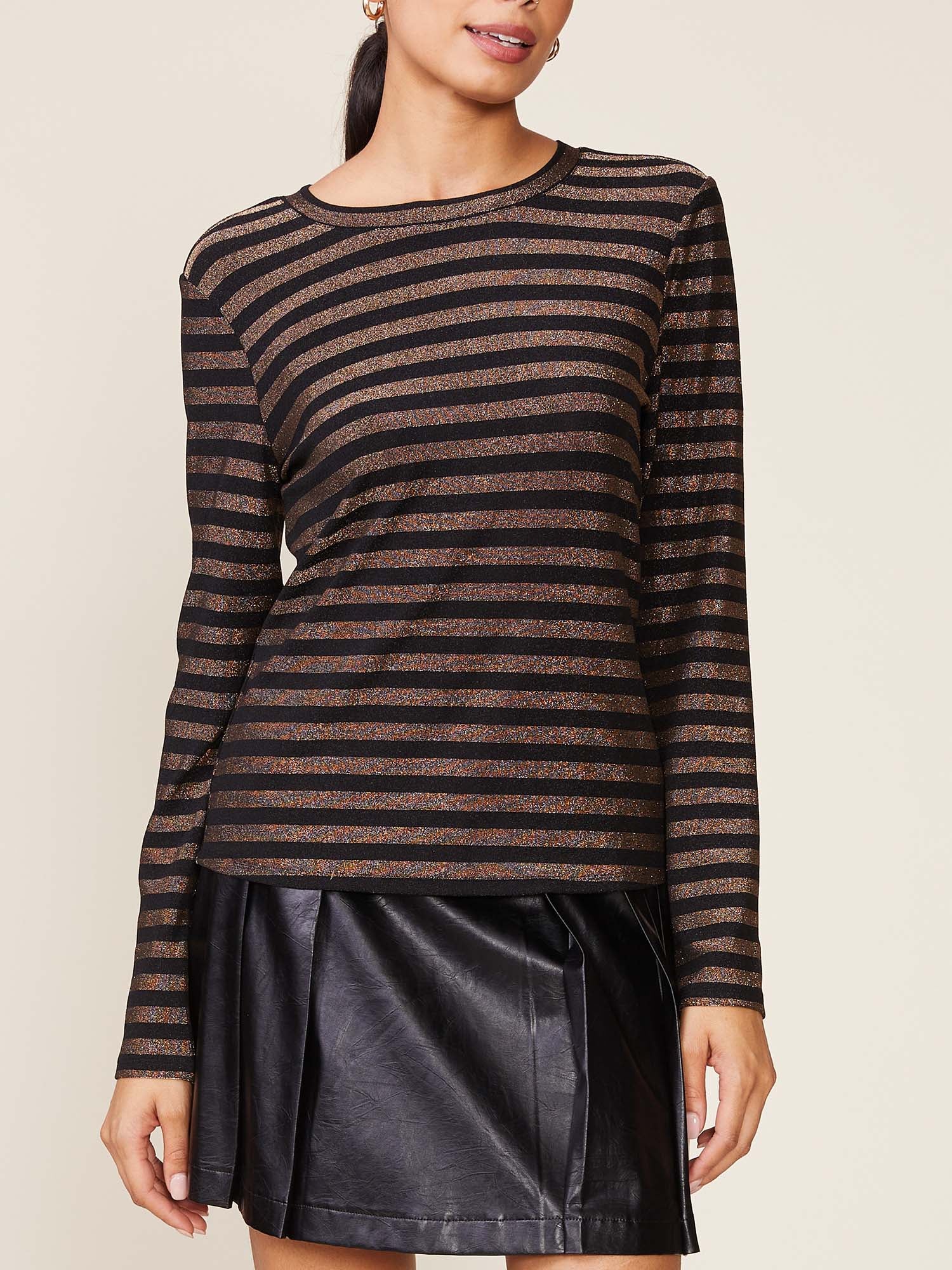 Look no further for your go to top of the season. This stripe long sleeve knit crew neck top is crafted in a shimmery knit stripe. It can go literally everywhere with you and make outfit options endless.
