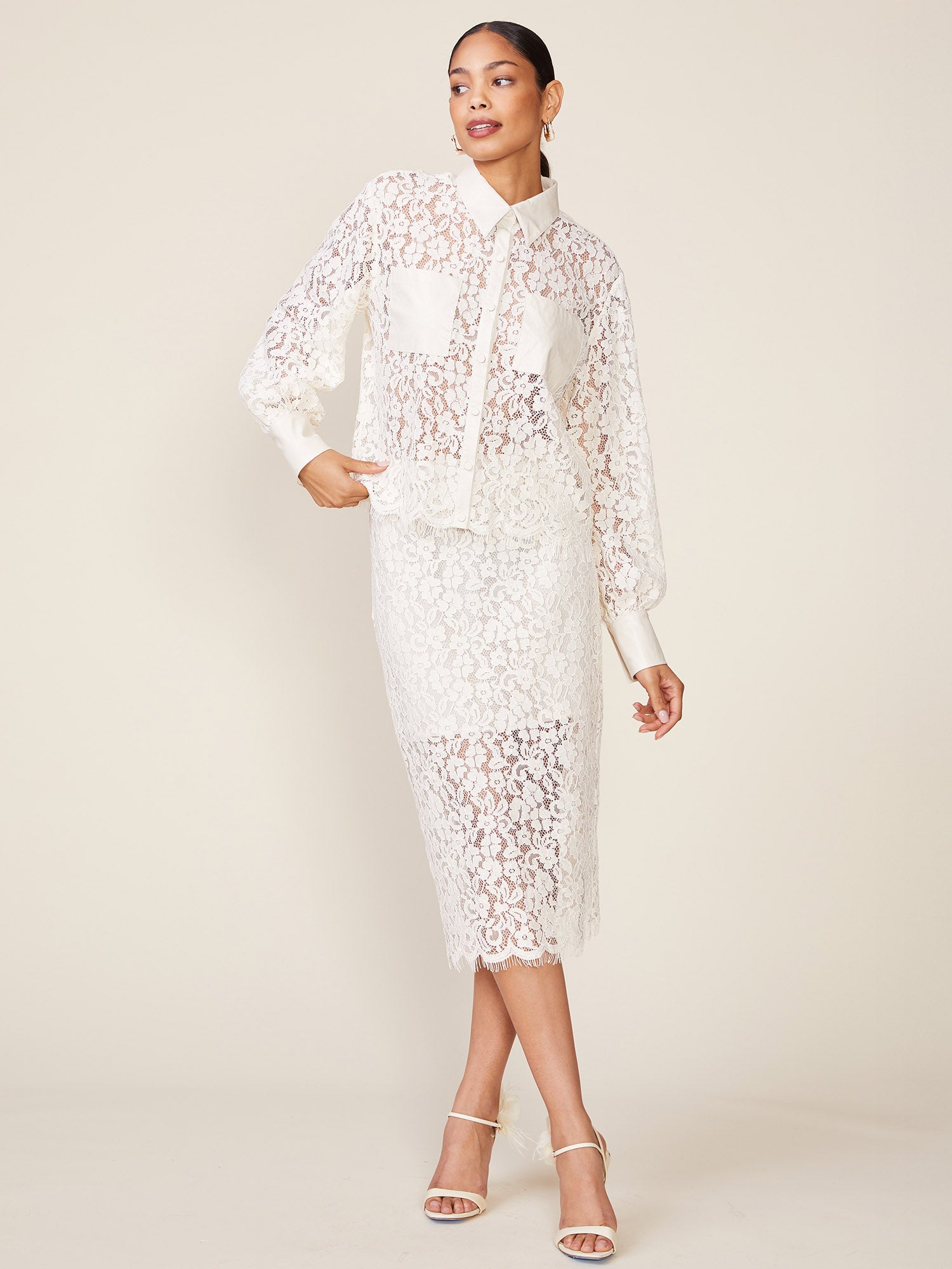 This blouse is the perfect blend of leather and lace. The long sleeve sheer button up is rimmed with crinkle vegan leather at the collar, cuffs, pockets and placket. Pair with the ANTHEM Lace Midi Skirt for a head-to-toe modern set.