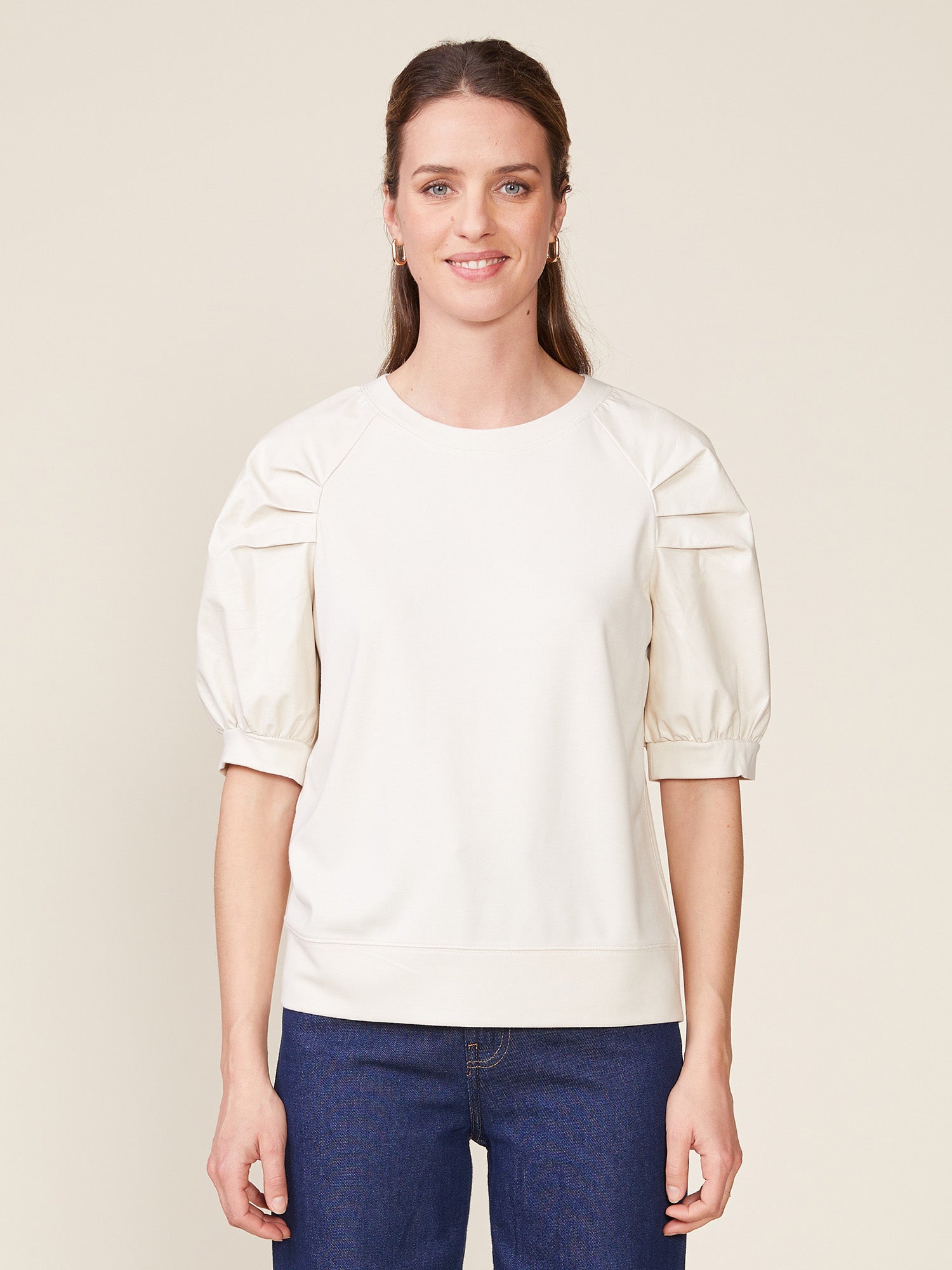 This short sleeve mixed media pullover pairs crinkle vegan leather with our lush mercury Ponte. A crew neck line and banded hem frames this silhouette. Pleat detailing at the sleeve give added interest while highlighting the contrasting fabrics.