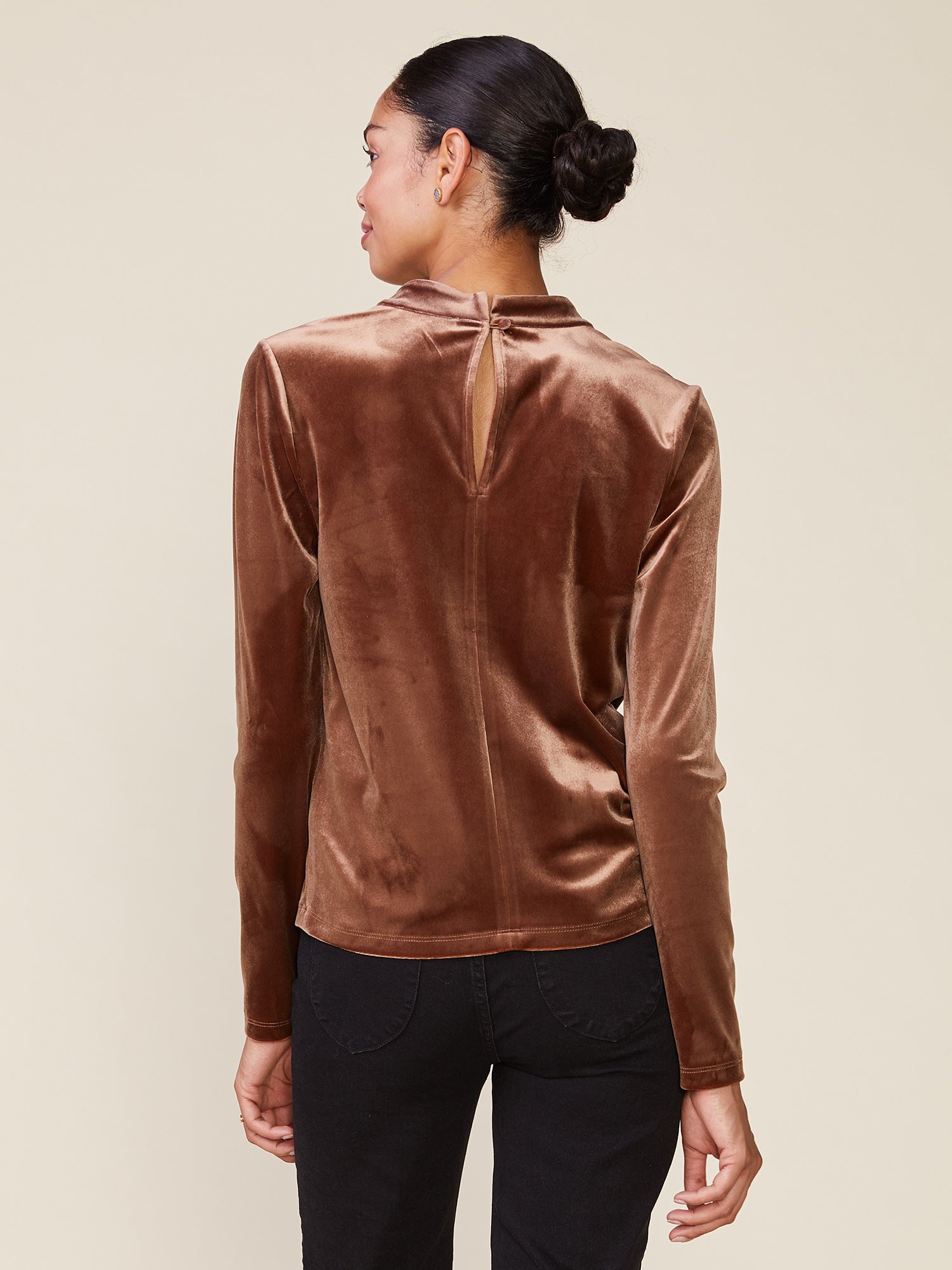 This long sleeve mock neck top with a triangular front keyhole is crafted in stretch velvet. It is the perfect canvas for a stunning holiday look. Both effortless and elegant, it doesn’t get any easier than this party ready top.